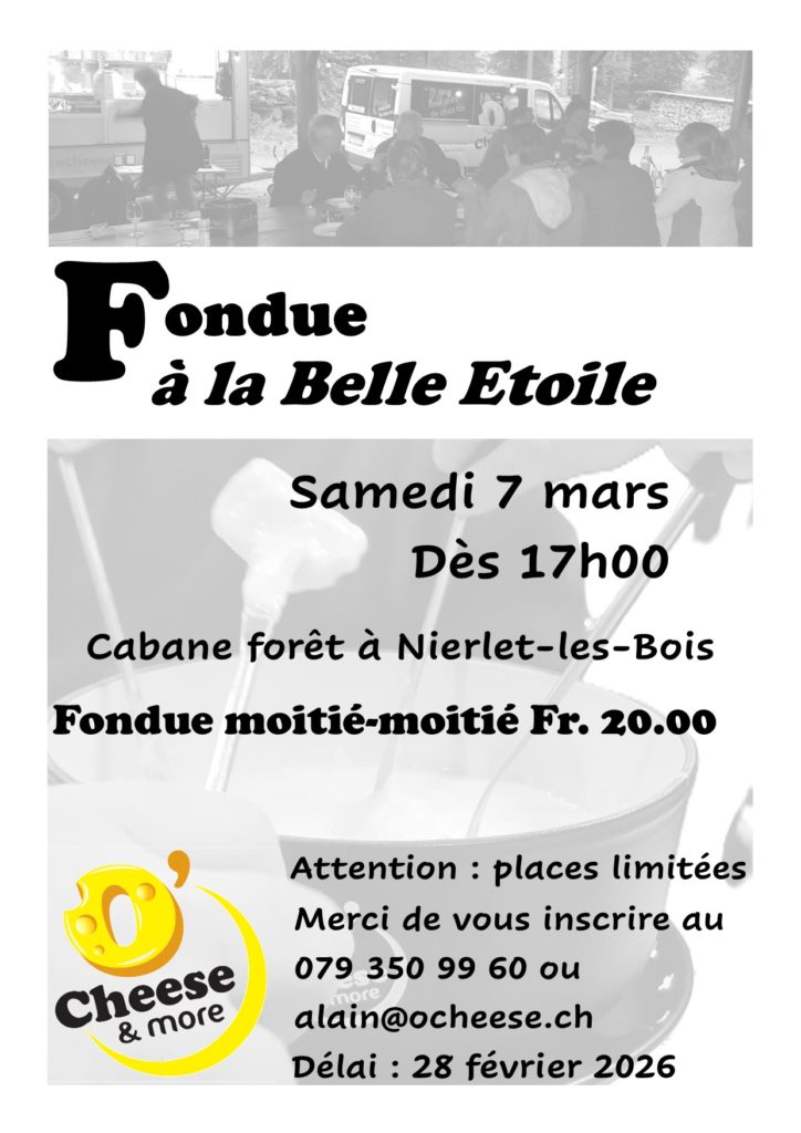 Fondue à la Belle Etoile Publié le 11 février 202611 février 2026 par alain Samedi 7 mars 2026 dès 17:00 Viens manger une bonne fondue moitié-moitié (fondue Rochat, classée 2ème des meilleures fondues Gault & Millau Suisse). ATTENTION, places limitées …